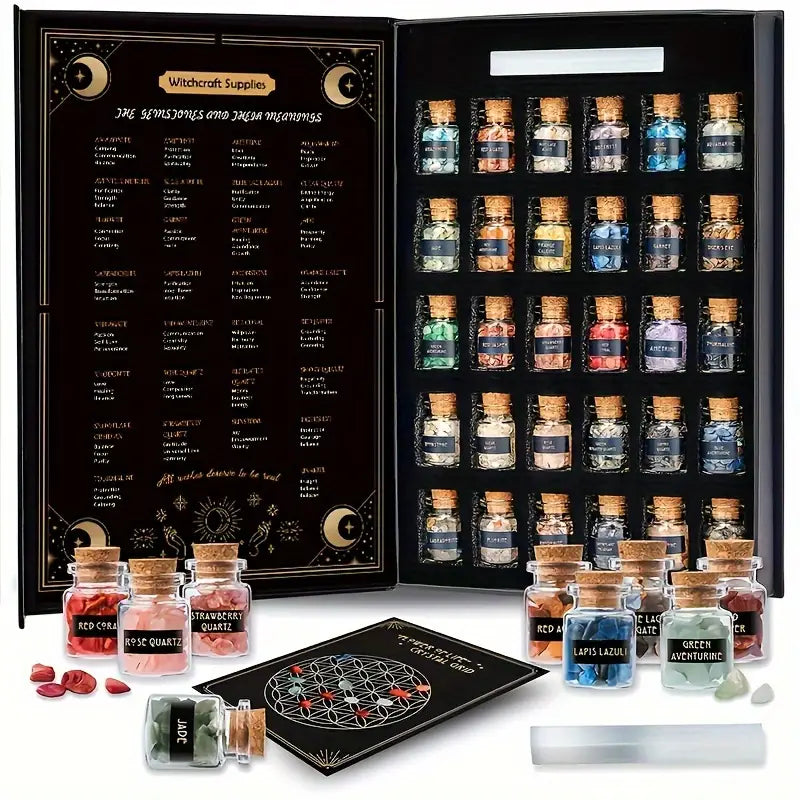 30-dielna minerálna súprava s podrobnými popismi o výskyte, vzniku a liečivých energiách kameňov + darček – krištáľová mriežka a selenitový blok!